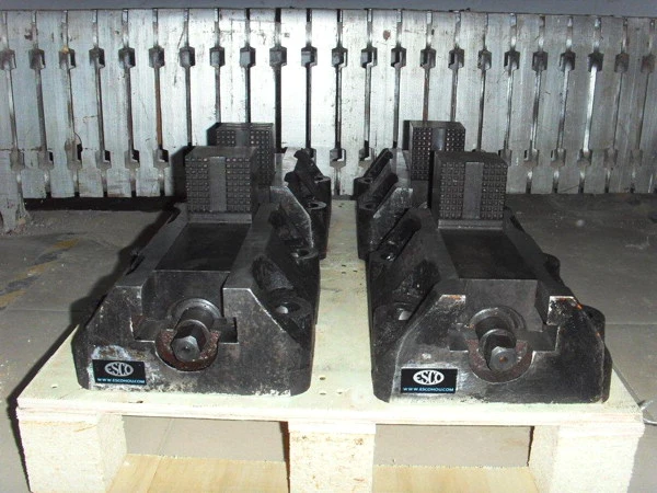 Set of (4) 12" x 7" Boring Mill type jaws for tables with double slots. Complete with (4) Hardened & Ground Serrated Jaws, Wrench Handle, (16) T-Nuts and (4) Bolts.